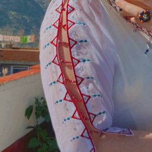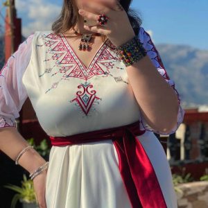 La touche rouge, couleur phare de la culture kabyle, vient souligner les broderies traditionnelles et apporter une contraste visuel puissant . Cette robe est également enrichie d’un perlage raffiné en cristal tout au long des manches : chaque geste devient lumineux, chaque mouvement capte la lumière. Une combinaison élégante qui honore l’héritage berbère tout en s’ouvrant à une vision absolument moderne de la tenue kabyle.
