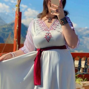 Symbole d’élégance intemporelle, la Robe Izilen est une robe kabyle de fête qui allie la sobriété du blanc neige à la force des détails rouges traditionnels . Conçue pour les grandes célébrations (mariages, fiançailles,…), elle se distingue par une coupe majestueuse et des finitions de haute qualité. Sa silhouette évoque une fleur qui s’ouvre, une beaute douce et imposante à la fois.