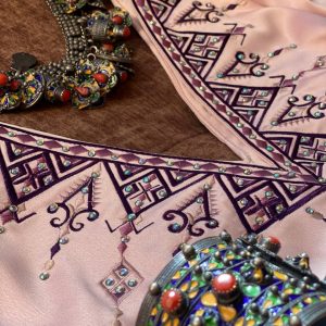 La Robe Tazmert est une somptueuse robe kabyle de fête en satin russe rose pale. Sa coupe double cloche très évasée et ses broderies en fil de soie lui confèrent une allure aussi élégante qu’authentique. Idéale pour mariages, fiançailles et évènement, elle marie l’héritage berbère à une élégance moderne.