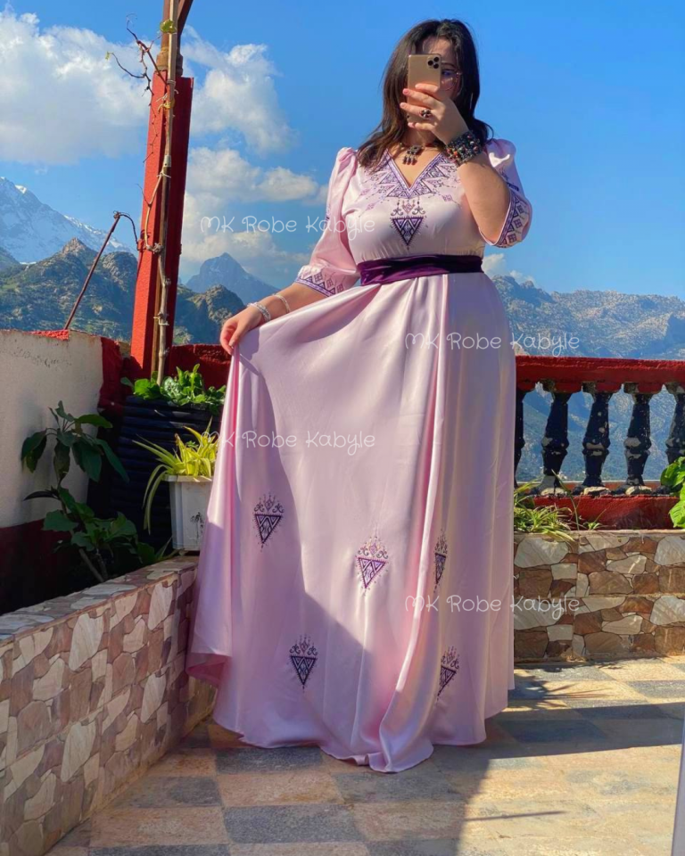 Traditionnellement, les robes kabyles arborent des couleurs vives (rouge, bleu, vert, jaune) symbolisant la joie et la fête. Mais en 2025, on voit émerger une tendance plus douce : la robe kabyle pastel ou dans des tons neutres. Imaginez une robe kabyle dans des nuances de rose poudré, de mauve lavande, de blanc cassé ou même de beige doré. Ces teintes apportent une touche de modernité subtile tout en restant raffinées. Les broderies kabyles, au lieu d’être multicolores, y sont souvent brodées en blanc, en argent ou dans une couleur légèrement contrastante pour rester dans l’harmonie pastel. Pourquoi on aime : ces robes offrent une alternative élégante pour celles qui préfèrent la sobriété à l’explosion de couleurs. Elles conviennent particulièrement aux occasions comme les engagements, les cérémonies de jour ou les réceptions chics, où l’on souhaite être tendance sans en faire trop. Côté morphologie, aucune restriction – les modèles pastel existent en coupes variées (évasée, droite, empire…). Notons qu’une robe kabyle tendance pastel fait aussi une excellente tenue pour les demoiselles d’honneur lors d’un mariage, surtout si la mariée porte du traditionnel plus coloré. Accessoirisez avec des éléments un peu plus flashy (une ceinture kabyle multicolore, des boucles d’oreilles turquoise) si vous voulez rappeler la tradition dans un ensemble très doux. Effet “wow” garanti par son originalité !